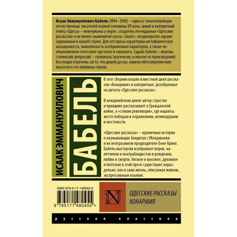 В этот сборник вошли известный цикл рассказов Бабеля "Конармия" и его бессмертные, разобранные на цитаты "Одесские рассказы". В конармейском цикле автор страстно и правдиво рассказывает о Гражданской войне, о "стихии революции", где нашлось место победам и поражениям, великодушию и жестокости. "Одесские рассказы" ироничные истории о неунывающих бандитах с Молдаванки и их неотразимом предводителе Бене Крике. Бабель мастерски изображает воров, налетчиков и контрабандистов в рождении, любви и смерти. Низкое и высокое, духовное и плотское в этой прозе существует нераздельно, как и сама жизнь, описанная живым, экспрессивным языком.