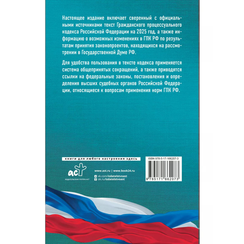 Данное издание Гражданского процессуального кодекса Российской Федерации сверено с официальным источником и приводится по состоянию на 2025 год. Кодекс учитывает все изменения, опубликованные в официальных источниках на момент подписания издания в печать. В издании представлена информация о возможных изменениях в ГПК РФ по результатам принятия законопроектов, находящихся на рассмотрении в Государственной Думе РФ. Для более удобного использования в тексте кодекса применяется система сокращенного написания отдельных слов и выражений, а также приводятся ссылки на федеральные законы, постановления и определения высших судебных органов Российской Федерации, относящиеся к вопросам применения норм ГПК.