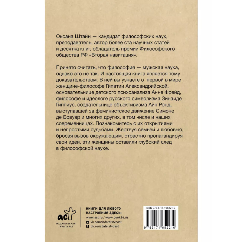 Оксана Штайн кандидат философских наук, преподаватель, автор более ста научных статей и десятка книг, обладатель премии Философского общества РФ "Вторая навигация". Принято считать, что философия мужская наука, однако это не так. И настоящая книга является тому доказательством. В ней вы узнаете о первой в мире женщине-философе Гипатии Александрийской, основательнице детского психоанализа Анне Фрейд, философе и идеологе русского символизма Зинаиде Гиппиус, создательнице объективизма Айн Рэнд, выступавшей за феминистское движение Симоне де Бовуар и многих других, в том числе и наших современницах. Познакомитесь с их открытиями и непростыми судьбами. Жертвуя семьей и любовью, бросая вызов окружающим, страстно пропагандируя свои идеи, эти женщины оставили глубокий след в философской науке.