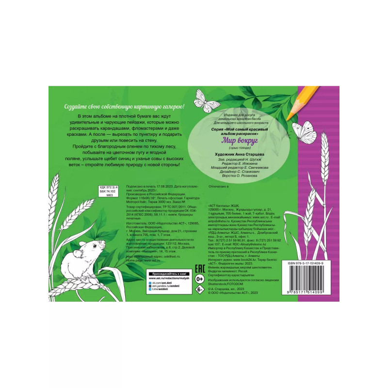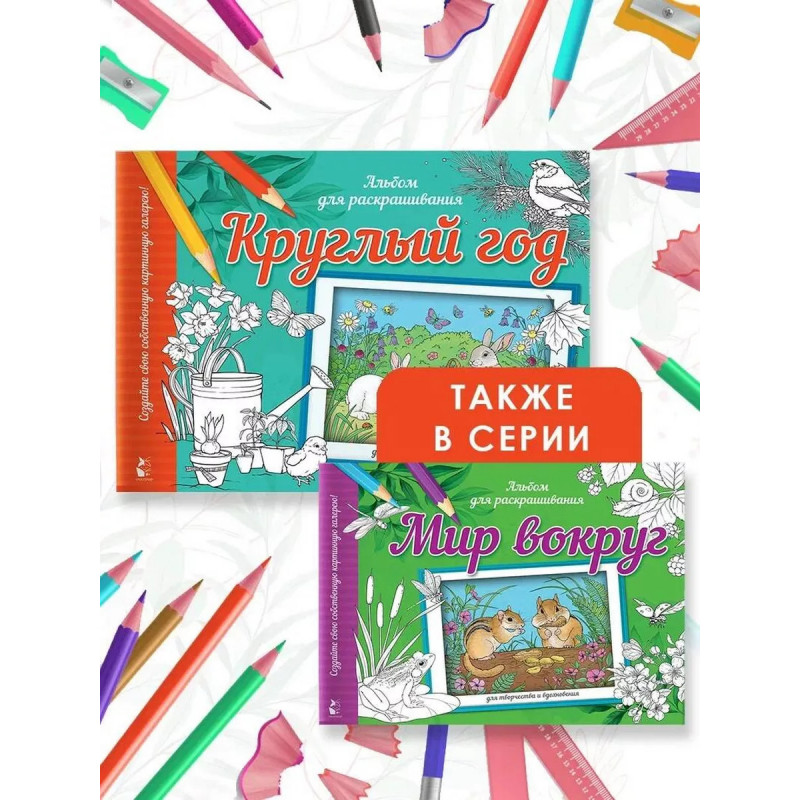 Мир вокруг. В этом альбоме на плотной бумаге вас ждут удивительные и чарующие пейзажи, которые можно раскрашивать карандашами, фломастерами и даже красками. А после - вырезать по пунктиру и подарить друзьям или повесить на стену. Пройдите с благородным оленем по тихому лесу, побывайте на цветочном лугу и ягодной поляне, услышьте щебет синиц и уханье совы с высоких веток - откройте любимую природу с новой стороны!