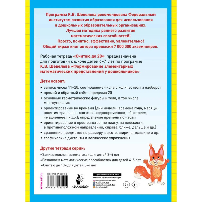 Рабочая тетрадь "Считаю до 2" содержит простые, увлекательные и эффективные упражнения, которые позволят сформировать элементарные математические представления, обобщить и систематизировать знания и умения, необходимые для успешного освоения программы начальной школы. Уникальная методика К. В. Шевелева прошла многолетнюю проверку и полностью соответствует требованиям Федерального государственного образовательного стандарта. Авторская программа рекомендована Федеральным институтом развития образования для использования в дошкольных образовательных организациях. Выстроить систему занятия по формированию универсальных познавательных и интеллектуальных компетенций у детей с 3 лет можно с использованием других тетрадей данной серии. Для дошкольного возраста.