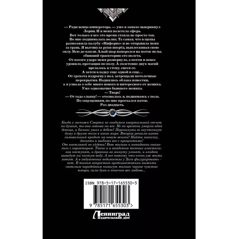 Когда у госпожи Смерти не сходится квартальный отчет по душам, то она готова на всё. Не ко времени умерла одна деви- ца, и баланс ушел в дебет? Перекинуть ее неучтенную душу в другое тело в ином мире. Вторая решила взять самовольный кредит на новую жизнь? Найти нахалку, догнать и выбить все с процентами! От костлявой не уйдешь! Вот только и попаданки оказа- лись с характером. Такие и в академию темных властелинов поступят, и дракона за минуту угонят, и злодеев выведут на чистую воду. А все потому что очень уж жить хотят. А в заду- шевных ведомостях у Хель фигурировать нет. В таком непростом противостоянии выжить светлым чаро- дейкам помогут только черное чувство юмора, сила духа и ко- нечно же любовь...