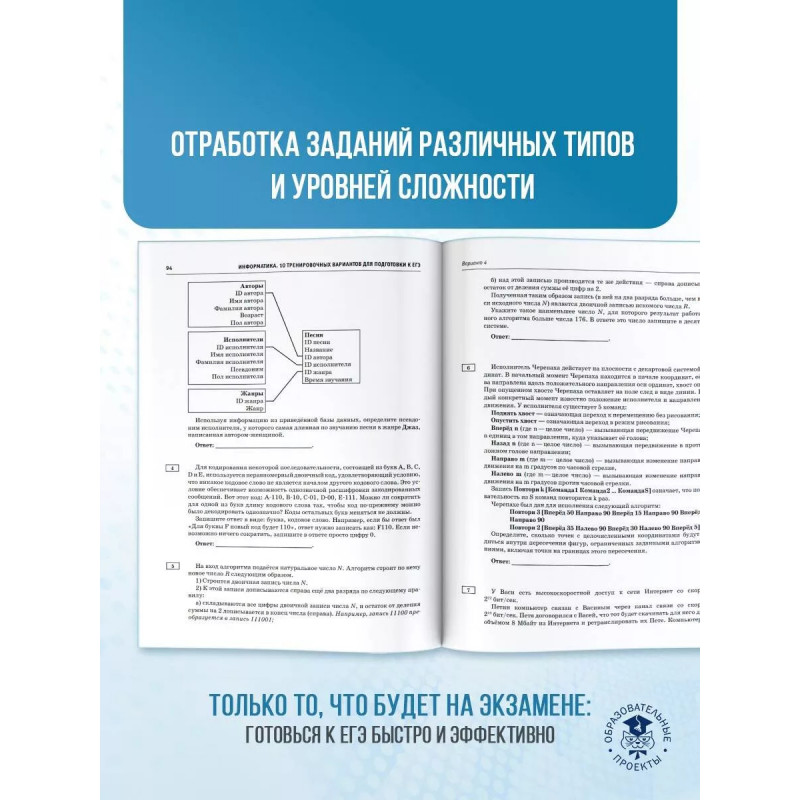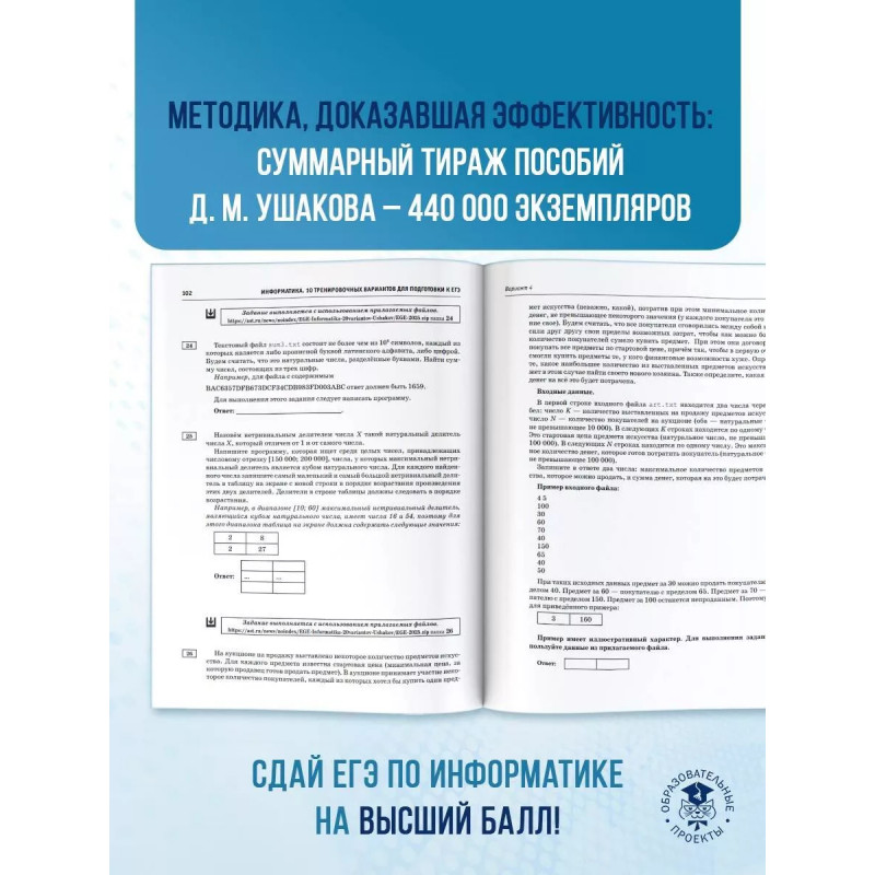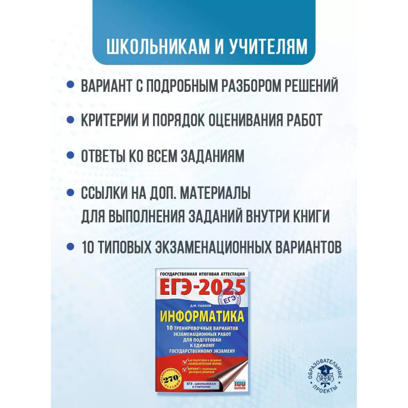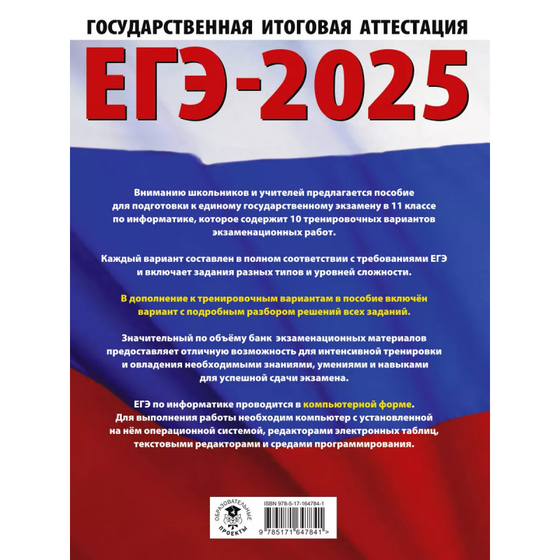 Вниманию школьников и абитуриентов предлагается пособие для подготовки к ЕГЭ, которое содержит 10 тренировочных вариантов экзаменационных работ. Особенностью данного сборника является вариант с подробным разбором каждого задания. Представленные алгоритмы будут полезны при проверке и оценке своих навыков и умений в решении типовых экзаменационных заданий. Каждый экзаменационный вариант в сборнике составлен в соответствии с требованиями единого государственного экзамена, включает задания разных типов и сложности по основным разделам курса информатики. ЕГЭ по информатике проводится в компьютерной форме. В конце пособия даны ответы для самопроверки на все задания. Материал сборника может быть использован для планомерного повторения изученного материала и тренировки выполнения заданий различного типа при подготовке к единому государственному экзамену.