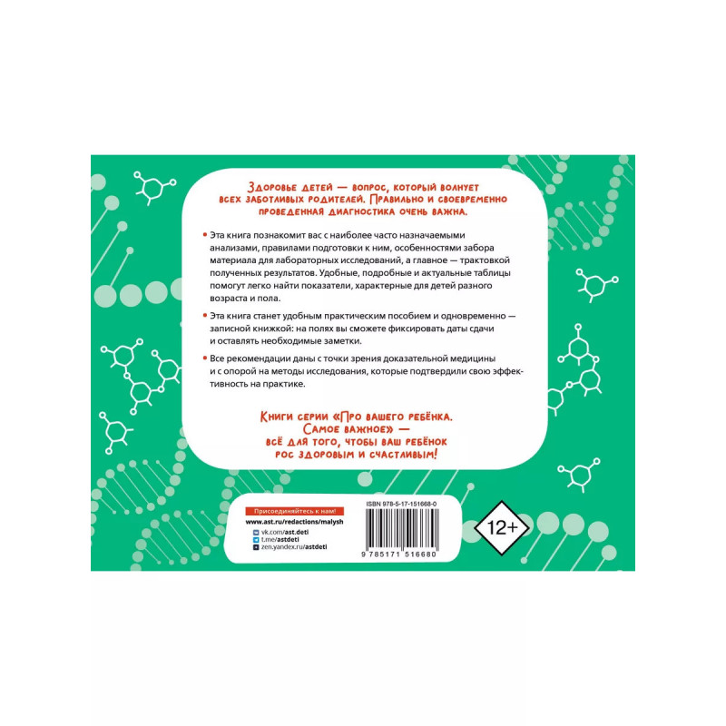 Бумажные медицинские карты ушли в прошлое, но они продолжают оставаться актуальными. Предлагаем вашему вниманию современную медицинскую карту для вашего ребенка с достоверной информацией о самых часто назначаемых анализах, а также с календарем прививок. Доступная трактовка результатов и советы специалиста помогут защитить здоровье вашего малыша. В этой книге вы сможете сохранить важные сведения, которые облегчат задачу специалистов по собру анамнеза и оказанию квалифицированной помощи. Автор книги Елена Тюменцева практикующий педиатр и неонатолог, автор научных статей и профессионального блога, сторонник доказательной медицины, мама двоих детей.