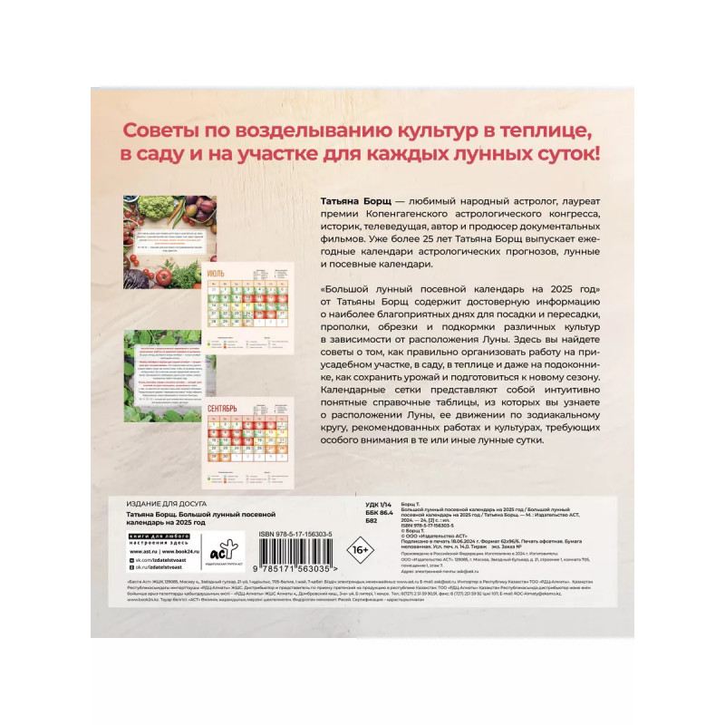 Татьяна Борщ любимый народный астролог, лауреат премии Копенгагенского астрологического конгресса, историк, телеведущая, автор и продюсер документальных фильмов. Уже более 25 лет Татьяна Борщ выпускает ежегодные календари астрологических прогнозов, лунные и посевные календари. "Большой лунный посевной календарь на 2025 год" от Татьяны Борщ содержит достоверную информацию о наиболее благоприятных днях для посадки и пересадки, прополки, обрезки и подкормки различных культур в зависимости от расположения Луны. Здесь вы найдете советы о том, как правильно организовать работу на приусадебном участке, в саду, в теплице и даже на подоконнике, как сохранить урожай и подготовиться к новому сезону. Календарные сетки представляют собой интуитивно понятные справочные таблицы, из которых вы узнаете о расположении Луны, ее движении по зодиакальному кругу, рекомендованных работах и культурах, требующих особого внимания в те или иные лунные сутки.