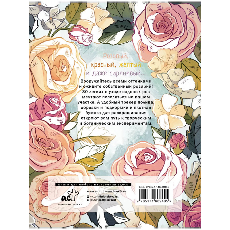 Раскраска-трекер. Розы. Розовый, красный, желтый и даже сиреневый. Вооружайтесь всеми оттенками и оживите собственный розарий! 30 легких в уходе садовых роз мечтают поселиться на вашем участке. А удобный трекер полива, обрезки и подкормки и плотная бумага для раскрашивания откроют вам путь к творческим и ботаническим экспериментам.