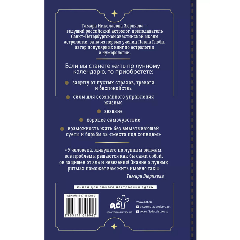 На протяжении всей жизни человек подвергается влиянию космических ритмов. Во все времена многие успешные люди планировали свою жизнь по лунному календарю. С Луной связаны скрытые тайные силы, которые влияют на подсознание человека. Поэтому учет положения Луны помогает распутать узлы проблем, а также избегать многих ошибок. Автор книги Тамара Зюрняева ведущий российский астролог, преподаватель Санкт-Петербургской авестийской школы астрологии, предлагает разобраться в лунном календаре и лунных днях. В книге вы найдете информацию о каждом лунном дне до 2050 года! Вычислите, в какие дни Луна покровительствует вашим начинаниям, какие обстоятельства в определенный день могут помешать вашим делам. С помощью книги вы сможете составлять собственные прогнозы. Если вы станете жить по лунному календарю, то приобретете: защиту от пустых страхов, тревоги и беспокойства; силы для осознанного управления жизнью; везение; хорошее самочувствие; возможность жить без выматывающей суеты и борьбы за "место под солнцем".