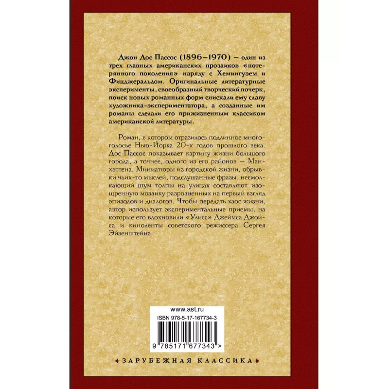 Один из самых важных романов Джона Дос Пассоса. Входит в число 100 главных книг XX века по версии газеты Le Monde. Роман, в котором отразилось подлинное многоголосье Нью-Йорка 20-х годов прошлого века. Дос Пассос показывает картину жизни большого города, а точнее, одного из его районов Манхэттена. Миниатюры из городской жизни, обрывки чьих-то мыслей, подслушанные фразы, несмолкающий шум толпы на улицах составляют изощренную мозаику разрозненных на первый взгляд эпизодов и диалогов. Чтобы передать хаос жизни, автор использует экспериментальные приемы, на которые его вдохновили Улисс Джеймса Джойса и киноленты советского режиссера Сергея Эйзенштейна.