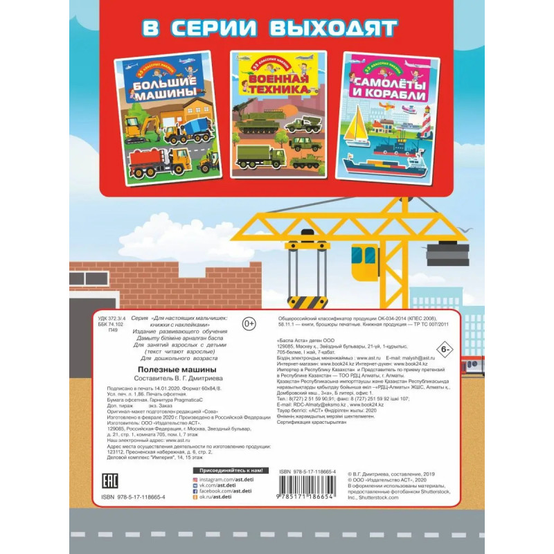 О чем эта книга Полезные машины это увлекательные развивающие задания + чудесные красочные наклейки для знакомства с автомобильной техникой. Кому эта книга будет интересна Эффективный тренажер для развития познавательных способностей + коллекция стикеров специально для компании дружных и веселых мальчишек, а также их родителей. Каковы особенности этой книги Выполняя интереснее задания и знакомясь с машинами-помощниками, дошколята будут читать, считать, сравнивать, экспериментировать, фантазировать, думать и играть. Бонус к развивающим заданиям большая коллекция красочных стикеров машин-помощников и автомобильной техники. Яркие наклейки сделают игры интересными и полезными помогут ребенку тренировать пальчики, развивать внимание, мышление, фантазию. Коллекция наклеек-машинок и игровые задания позволят ребёнку интересно и полезно провести время.