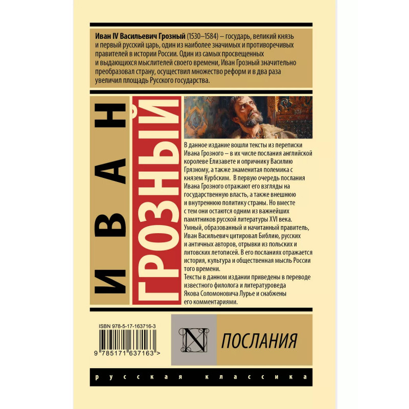 Памятник русской литературы XVI века. Русский царь Иван Грозный был умным, образованным и начитанным правителем мог спокойно цитировать Библию, произведения русских и античных авторов, отрывки из польских и литовских летописей. А еще он вел крайне обширную переписку с другими монархами и собственными вассалами. Его письма в первую очередь отражают взгляды царя на государственную власть, внешнюю и внутреннюю политику страны. В его посланиях отражаются история, культура и общественная мысль России того времени. Все тексты в данном издании приведены в переводе и с комментариями известного филолога и литературоведа Якова Лурье.