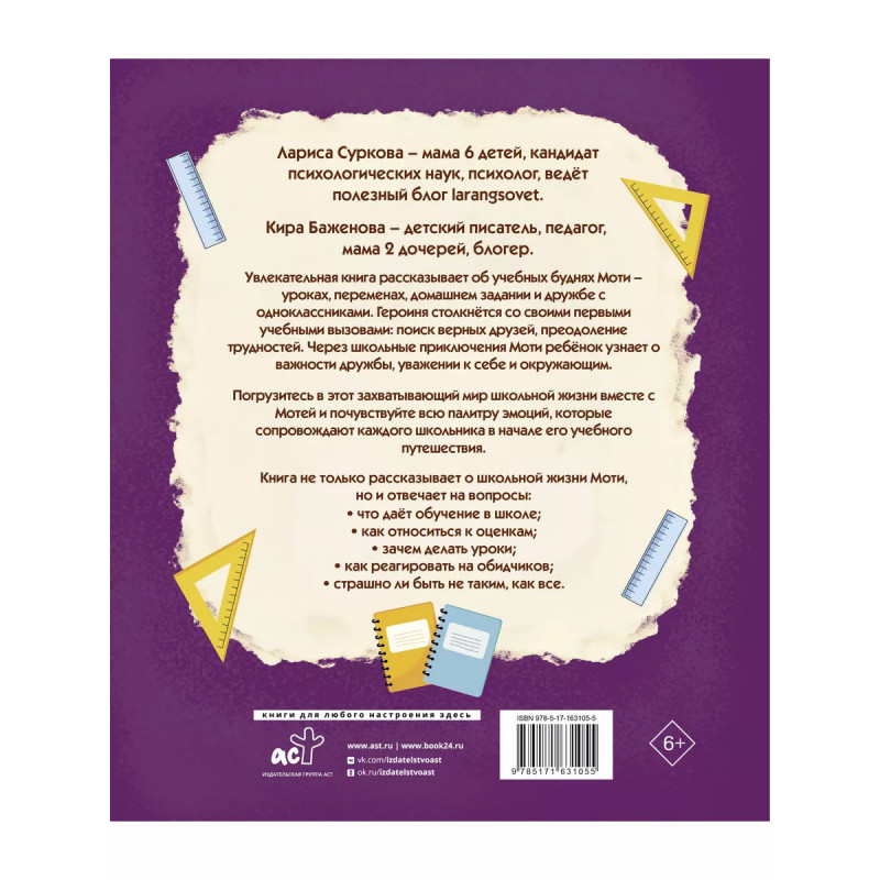 Лариса Суркова мама 7 детей, кандидат психологических наук, психолог, ведёт полезный блог larangsovet. Кира Баженова детский писатель, педагог, мама 2 дочерей, блогер. Увлекательная книга рассказывает об учебных буднях девочки Моти уроках, переменах, домашнем задании и дружбе с одноклассниками. Героиня столкнётся со своими первыми учебными вызовами: поиск верных друзей, преодоление трудностей. Через школьные приключения Моти ребёнок узнает о важности дружбы, уважении к себе и окружающим. Погрузитесь в этот захватывающий мир школьной жизни вместе с Мотей и почувствуйте всю палитру эмоций, которые сопровождают каждого школьника в его начале учебного путешествия. Книга не только рассказывает о школьной жизни Моти, но и отвечает на вопросы: что даёт обучение в школе; как относиться к оценкам; зачем делать уроки; как реагировать на обидчиков; страшно ли быть не таким, как все.