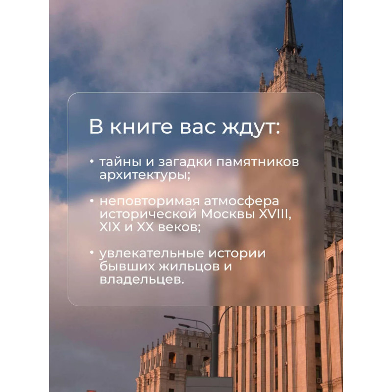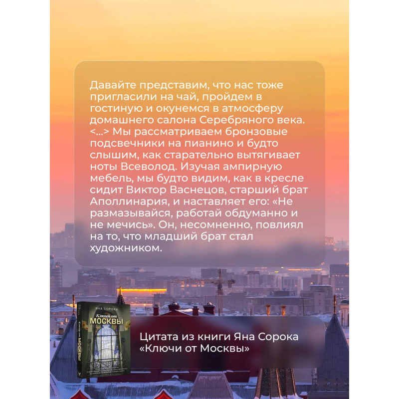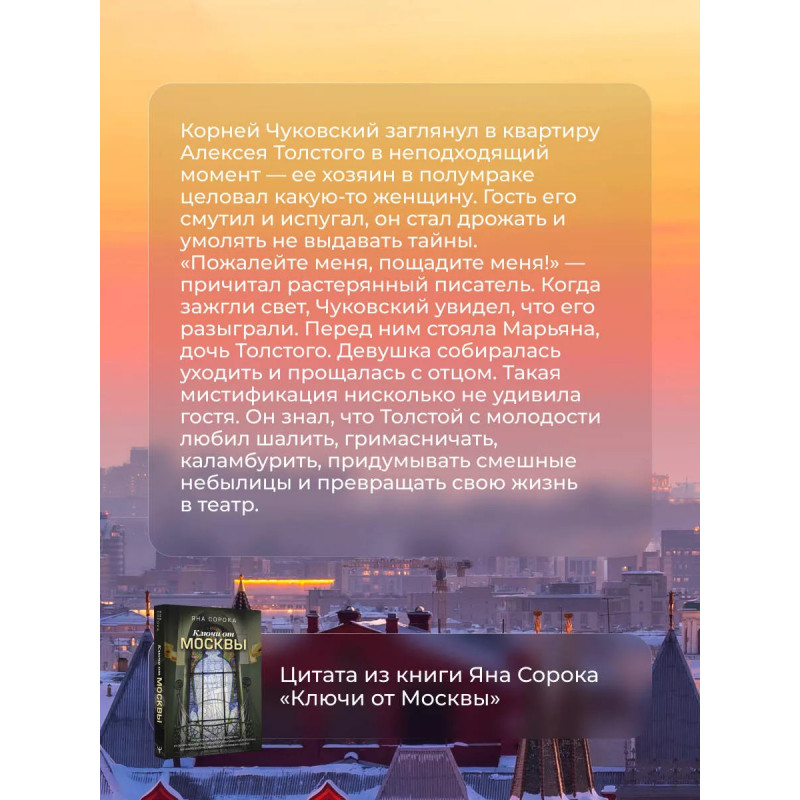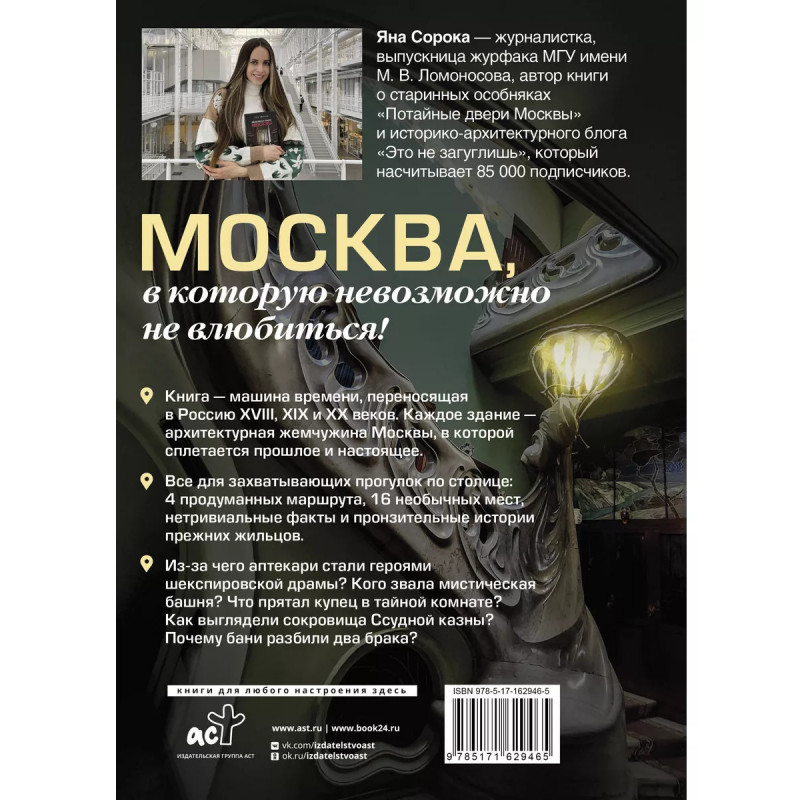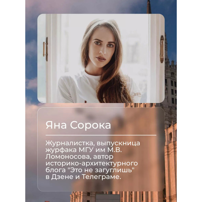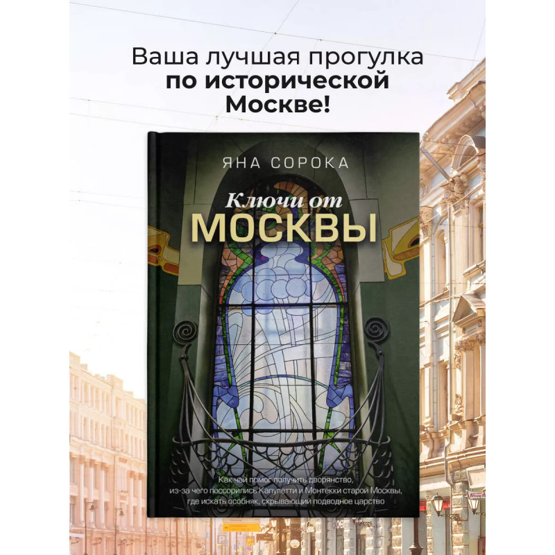 Яна Сорока журналистка, выпускница журфака МГУ имени М. В. Ломоносова, автор книги о старинных особняках "Потайные двери Москвы" и историко-архитектурного блога "Это не загуглишь", который насчитывает 85 000 подписчиков. Из-за чего аптекари стали героями шекспировской драмы? Что прятал купец в тайной комнате? Для чего гимназист затопил кабинет директора? И как бани разбили два брака? "Ключи от Москвы" книга, которая открывает 16 дверей самых изысканных, загадочных и необычных домов города. Каждое здание это не только архитектурная жемчужина Москвы, но и хранилище опасных секретов, пронзительных драм, любви и надежд прежних жильцов. Совершите путешествие в прошлое.