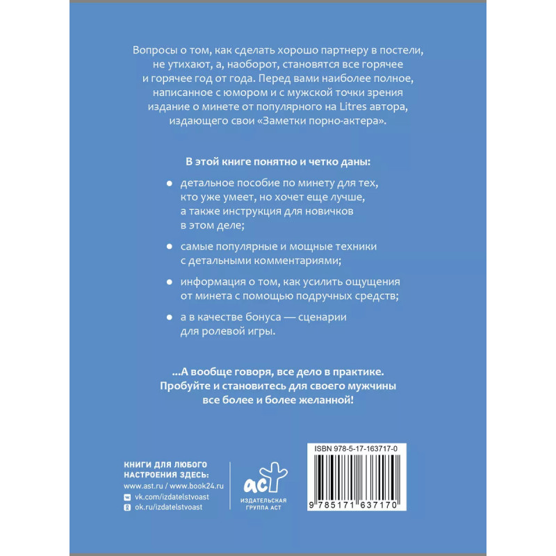 Вопросы о том, как сделать хорошо партнеру в постели, не утихают, а, наоборот, становятся все горячее и горячее год от года. Перед вами наиболее полное, написанное с юмором и с мужской точки зрения издание о минете от популярного на Litres автора, издающего свои "Заметки порно-актера". В этой книге понятно и четко даны: детальное пособие по минету для тех, кто уже умеет, но хочет еще лучше, а также инструкция для новичков в этом деле; самые популярные и мощные техники с детальными комментариями; информация о том, как усилить ощущения от минета с помощью подручных средств; а в качестве бонуса сценарии для ролевой игры. А вообще говоря, все дело в практике. Пробуйте и становитесь для своего мужчины все более и более желанной!