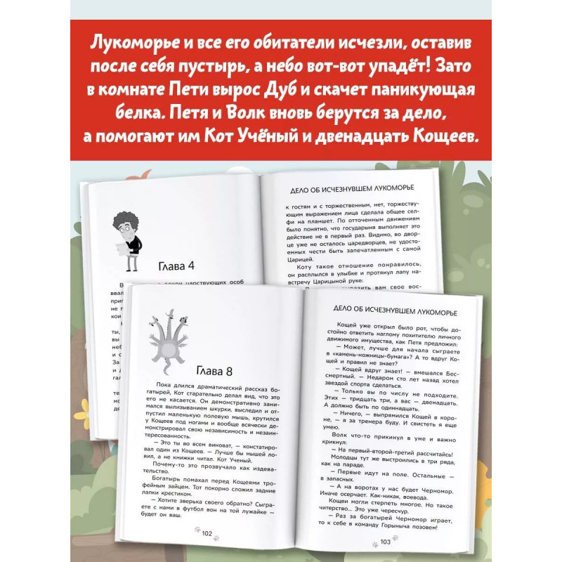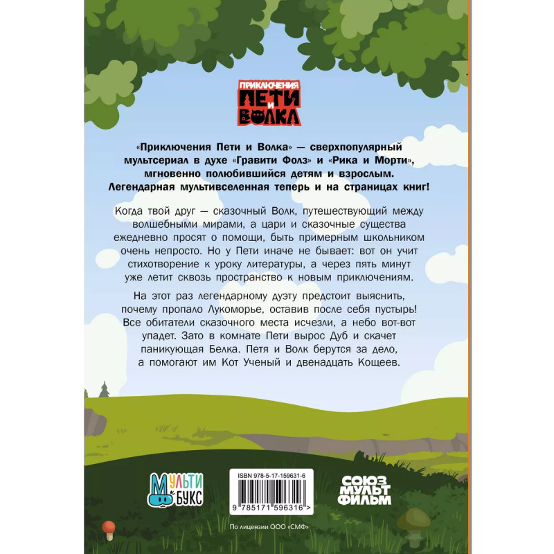 Когда твой друг сказочный Волк, путешествующий между волшебными мирами, а цари и сказочные существа ежедневно просят о помощи, быть примерным школьником очень непросто. Но у Пети иначе не бывает: вот он учит стихотворение к уроку литературы, а через пять минут уже летит сквозь пространство к новым приключениям. На этот раз легендарному дуэту предстоит выяснить, почему пропало Лукоморье, оставив после себя пустырь! Все обитатели сказочного места исчезли, а небо вот-вот упадет. Зато в комнате Пети вырос Дуб и скачет паникующая белка. Петя и Волк берутся за дело, а помогают им Кот Ученый и двенадцать Кощеев.