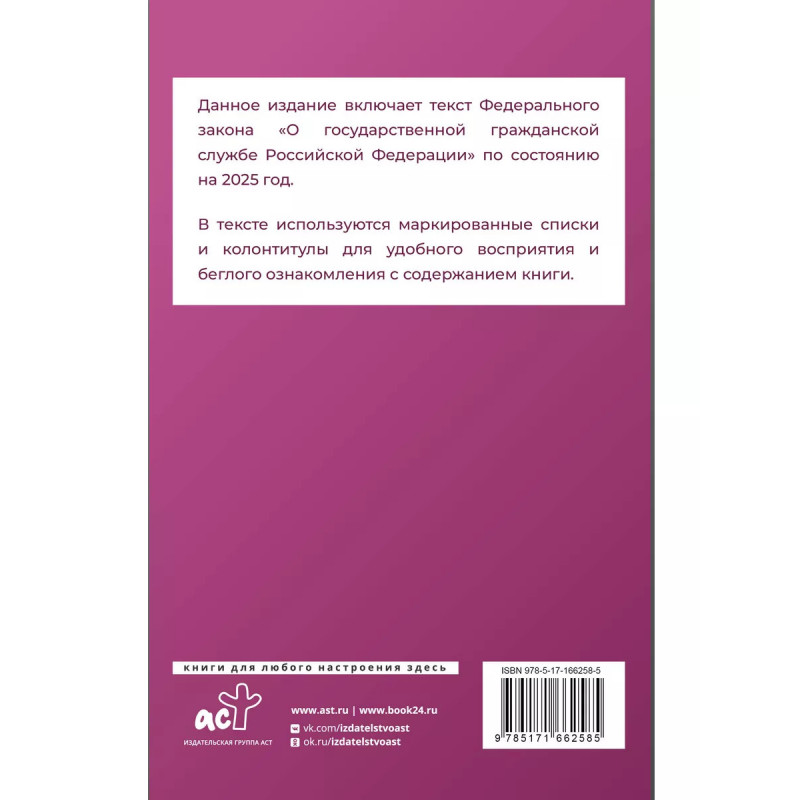 Данное издание включает текст Федерального закона "О государственной гражданской службе Российской Федерации" на 2025 год. В тексте используются маркированные списки и колонтитулы для удобного восприятия и беглого ознакомления с содержанием книги. Издание учитывает все изменения, опубликованные в официальных источниках на момент подписания издания в печать.