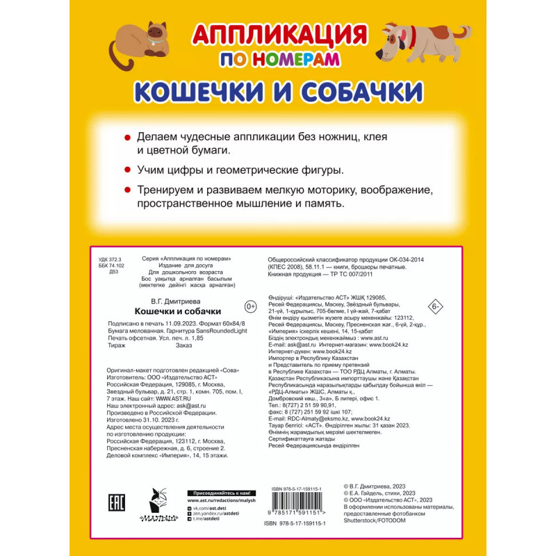 Кошечки и собачки. Чтобы создать красивую аппликацию, достаточно купить нашу книгу "Кошечки и собачки". Ребёнку не потребуются ножницы, клей и набор цветной бумаги. Находишь наклейки с определённым номером, приклеиваешь их - и чудесная картинка готова. Но это ещё не всё! Увлечённый творческим процессом малыш сам не заметит, как выучит цифры, геометрические фигуры, получит представление о понятиях "больше-меньше", "ближе-дальше", "выше-ниже", а также потренирует мелкую моторику, внимание и память. Аппликации с милыми котятами и щенками понравятся всем!