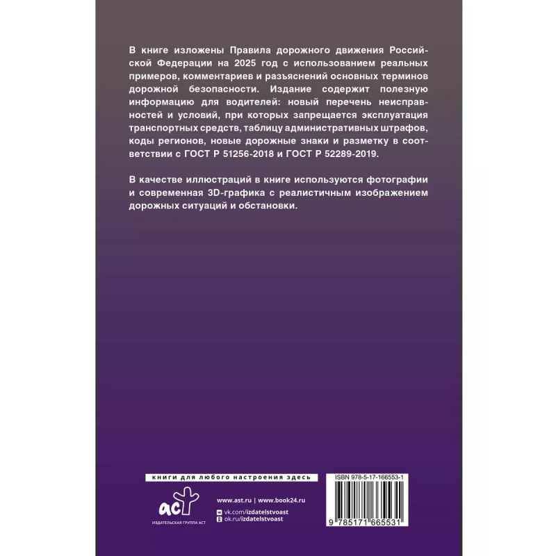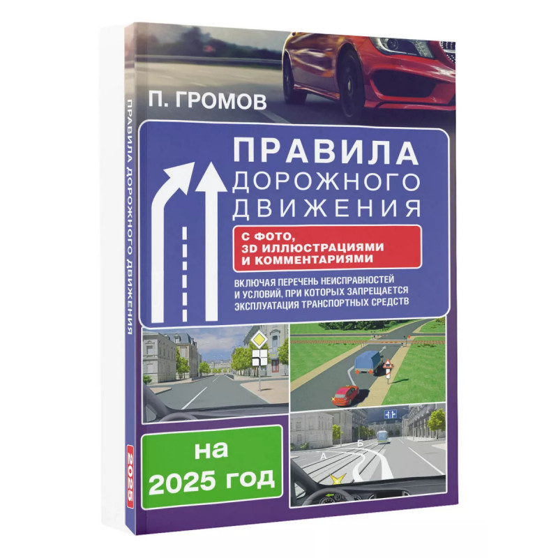 В книге изложены Правила дорожного движения Российской Федерации на 2025 год с использованием реальных примеров, комментариев и разъяснений основных терминов дорожной безопасности. Издание содержит полезную информацию для водителей: таблицу административных штрафов, коды регионов, новые дорожные знаки и разметку в соответствии с ГОСТ Р 51256-2018 и ГОСТ Р 52289-2019. В качестве иллюстраций в книге используются фотографии и современная 3D-графика с реалистичным изображением дорожных ситуаций и обстановки. Для специалистов, практиков, водителей транспортных средств. Издание учитывает все изменения, опубликованные в официальных источниках на момент подписания издания в печать.