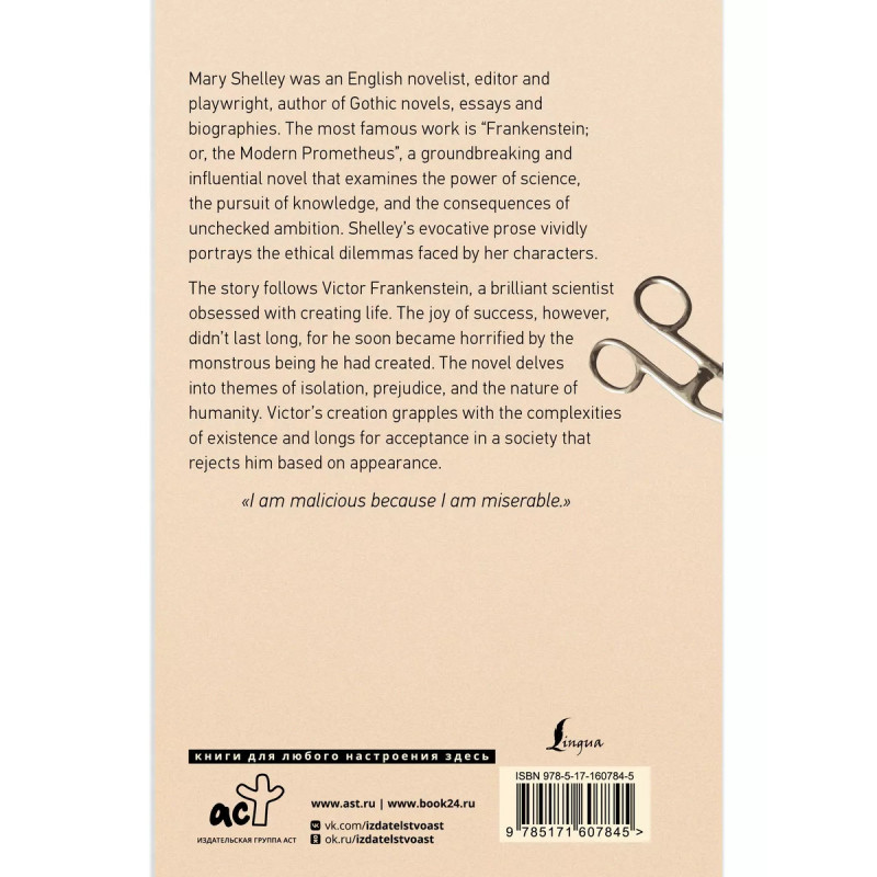 Frankenstein; or, The Modern Prometheus. "Франкенштейн, или Современный Прометей" - готическое произведение английской писательницы Мэри Шелли, которое стало одним из самых популярных фантастических романов. Пугающая история об учёном по имени Виктор Франкенштейн, который решился постичь тайну зарождения жизни и смог создать человека. Но не просто человека, а живое чудовище, созданное из частей трупов. Учёный даже не предполагает, как дорого ему обойдётся его опасный и пугающий эксперимент. Насладитесь популярным готическим романом в оригинале - без адаптации и сокращений!
