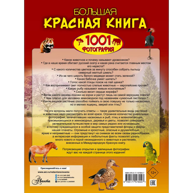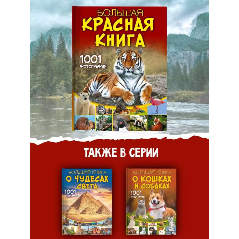 Большая красная книга. 1001 фотография. Чтобы познакомиться с животными и растениями, которые внесены в Красную книгу Международного союза охраны природы и природных ресурсов, вовсе не нужно отправляться в заповедники, совершать путешествия на далекие острова, в тайгу или в джунгли и даже просто выезжать за город. Достаточно открыть эту книгу, и перед вашими глазами предстанут самые удивительные и неподражаемые, но при этом редкие, вымирающие или находящиеся в опасности обитатели живой природы нашей планеты. Разноцветные бабочки и длинноногие кузнечики, красующиеся своими жесткими надкрыльями жуки ияркие лягушки, большие свирепые акулы и плоские электрические скаты, мощные вараны и огромные морские черепахи, неутомимые быстрокрылые альбатросы и элегантные нежно-розовые фламинго, по- королевски роскошные амурские тигры и грациозные пятнистые леопарды, гигантские хищные цветы непентесы и могучие мамонтовые деревья - эти и многие другие растения и животные, нуждающиеся в особой защите и охране, запечатлены во всей красе на уникальных фотографиях, а ко