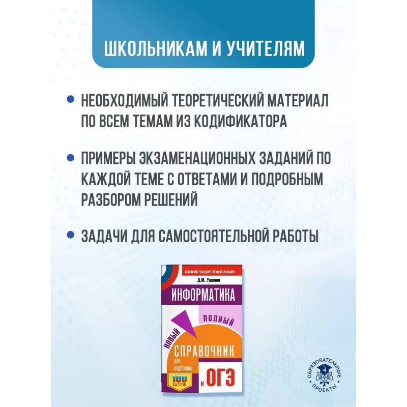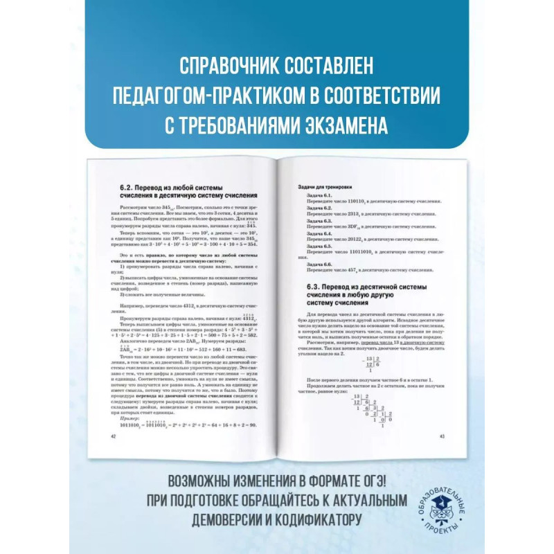 В справочнике представлен материал курса информатики в объёме, проверяемом на государственной итоговой аттестации. Структура справочника соответствует официальным требованиям к контрольным измерительным материалам (КИМ) для проведения ОГЭ. Материал сгруппирован по главам, в каждой из которых изучается определённая тема курса информатики и ИКТ, проверяемая на экзамене. Помимо теоретических сведений главы включают разбор экзаменационных заданий и задачи для самостоятельной тренировки с ответами и критериями оценки в конце пособия. Книга будет незаменимым помощником при подготовке к экзамену в формате ОГЭ, при изучении нового материала, повторении пройденных тем.