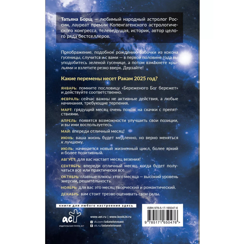 Татьяна Борщ любимый народный астролог России, лауреат премии Копенгагенского астрологического конгресса, телеведущая, историк, автор целого ряда бестселлеров. Преображение, подобное рождению бабочки из кокона гусеницы, случится и с вами, в первой половине года вы уподобитесь зеленой гусенице, а потом взмахнете крыльями и взлетите резко вверх. Дерзайте! Какие перемены несет Ракам 2025 год?