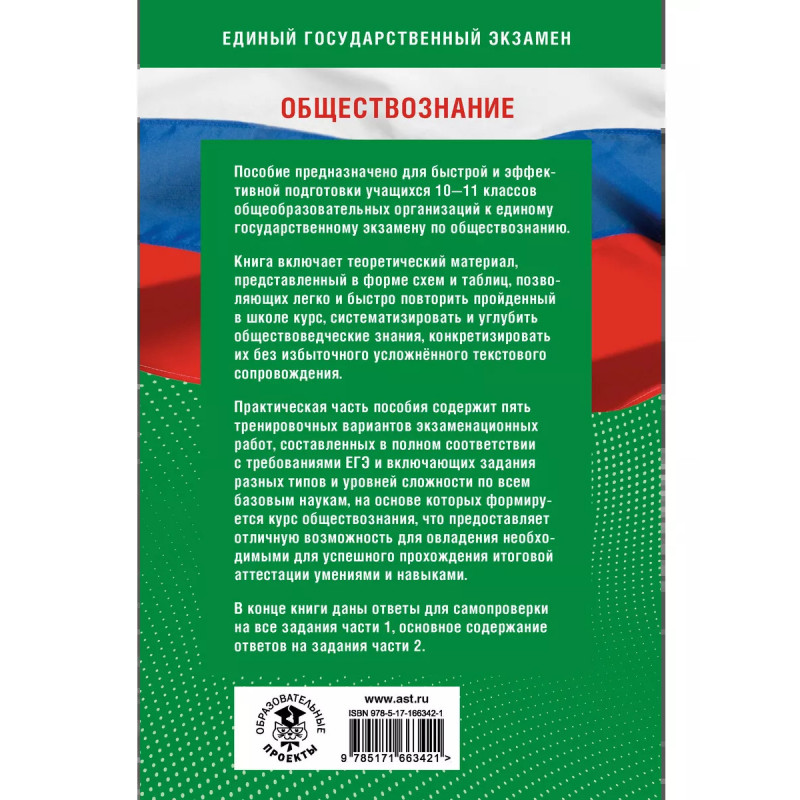 Пособие предназначено для быстрой и эффективной подготовки учащихся 10 11 классов общеобразовательных организаций к единому государственному экзамену по обществознанию. Книга включает теоретический материал, представленный в форме схем и таблиц, позволяющих легко и быстро повторить пройденный в школе курс, систематизировать и углубить обществоведческие знания, конкретизировать их без избыточного усложнённого текстового сопровождения. Практическая часть пособия содержит пять тренировочных вариантов экзаменационных работ, составленных в полном соответствии с требованиями ЕГЭ и включающих задания разных типов и уровней сложности по всем базовым наукам, на основе которых формируется курс обществознания, что предоставляет отличную возможность для овладения необходимыми для успешного прохождения итоговой аттестации умениями и навыками. В конце книги даны ответы для самопроверки на все задания части 1, основное содержание ответов на задания части 2.