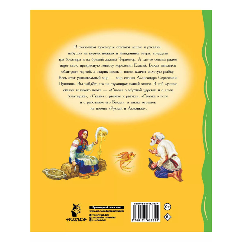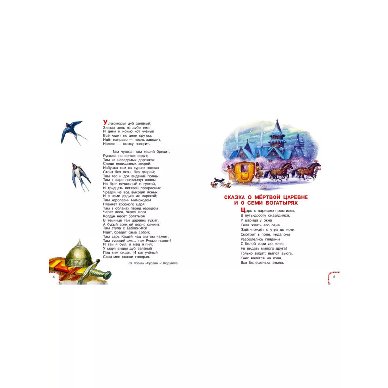 В сказочном лукоморье обитают лешие и русалки, избушка на курьих ножках и невиданные звери, тридцать три богатыря и их бравый дядька Черномор. А где-то совсем рядом ищет свою прекрасную невесту королевич Елисей, Балда пытается обхитрить чертей, а старик вновь и вновь кличет золотую рыбку. Весь этот удивительный мир мир сказок Александра Сергеевича Пушкина. Вы найдёте его на страницах нашей книги. В ней лучшие сказки великого поэта Сказка о мёртвой царевне и о семи богатырях, Сказка о золотой рыбке, Сказка о попе и работнике его Балде, а также отрывок из поэмы Руслан и Людмила.