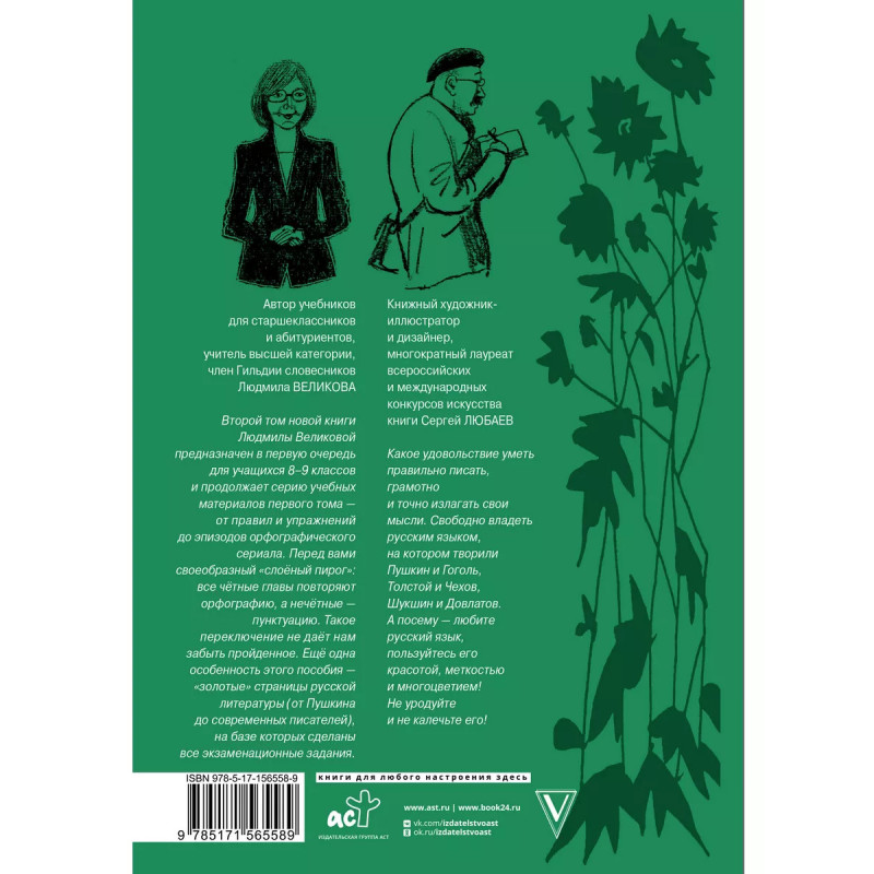 Русский язык. Слова и предложения. Второй том новой книги Людмилы Великовой предназначен в первую очередь для учащихся 8-9 классов и продолжает серию учебных материалов первого тома - от правил и упражнений до эпизодов орфографического сериала. Перед вами своеобразный "слоёный пирог": все чётные главы повторяют орфографию, а нечётные - пунктуацию. Такое переключение не даёт нам забыть пройденное. Ещё одна особенность этого пособия - "золотые" страницы русской литературы (от Пушкина до современных писателей), на базе которых сделаны все экзаменационные задания. Известно, что именно девятый класс подводит итоги программы по русскому языку за весь курс средней школы, поэтому эту книгу можно смело рекомендовать всем заинтересованным в совершенствовании своих знаний по орфографии и пунктуации.