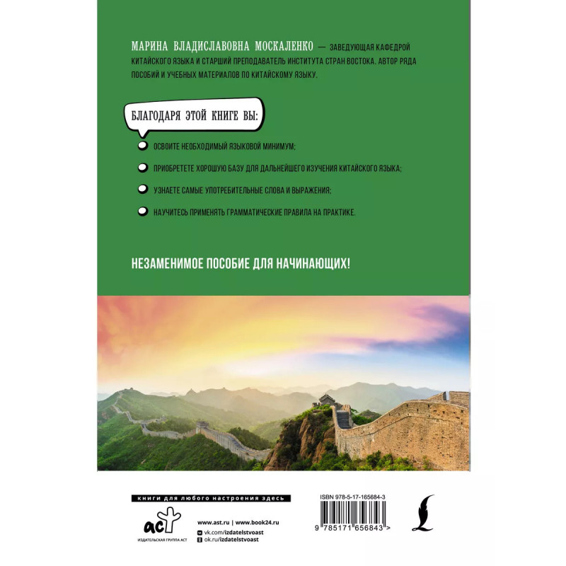 Марина Владиславовна Москаленко заведующая кафедрой китайского языка и старший преподаватель Института стран Востока. Автор ряда пособий и учебных материалов по китайскому языку. Книга охватывает весь объем грамматического, лексического и иероглифического материала, необходимого для изучения языка на начальном уровне. Для успешного закрепления пройденной темы в каждом уроке представлены упражнения, ключи к которым находятся в конце книги. Завершают издание приложения: справка по китайским членам предложения, таблица иероглифических ключей, таблица Палладия, счетные слова и таблица глаголов. Пособие предназначено для широкого круга лиц, изучающих китайский язык.