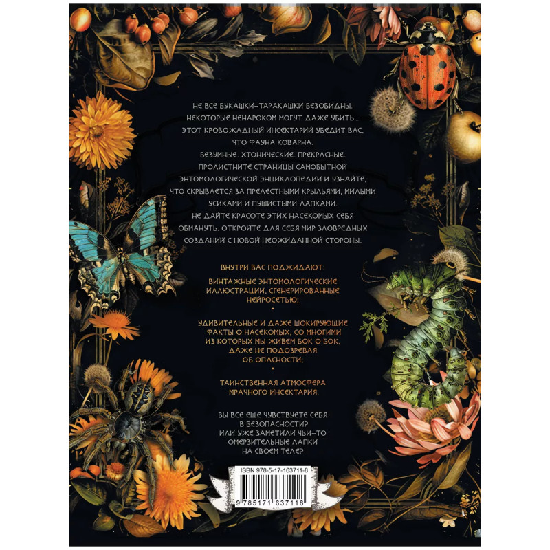 Не все букашки-таракашки безобидны. Некоторые ненароком могут даже убить Этот кровожадный инсектарий убедит вас, что фауна коварна. Безумные. Хтонические. Прекрасные. Пролистните страницы самобытной энтомологической энциклопедии и узнайте, что скрывается за прелестными крыльями, милыми усиками и пушистыми лапками. Не дайте красоте этих насекомых себя обмануть. Откройте для себя мир зловредных созданий с новой неожиданной стороны. Внутри вас поджидают: винтажные энтомологические иллюстрации, сгенерированные нейросетью; удивительные и даже шокирующие факты о насекомых, со многими из которых мы живем бок о бок, даже не подозревая об опасности; таинственная атмосфера мрачного инсектария. Вы все еще чувствуете себя в безопасности? Или уже заметили чьи-то омерзительные лапки на своем теле?