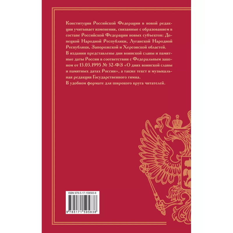 Конституция Российской Федерации с учетом образования в составе России новых субъектов. Дни воинской. Конституция Российской Федерации в новой редакции учитывает изменения, связанные с образованием в составе Российской Федерации новых субъектов: Донецкой Народной Республики, Луганской Народной Республики, Запорожской и Херсонской областей. В издании представлены дни воинской славы и памятные даты России в соответствии с Федеральным законом от 13(точка)3.1995 № 32-ФЗ "О днях воинской славы и памятных датах России", а также текст и музыкальная редакция Государственного гимна. В удобном формате для широкого круга читателей.