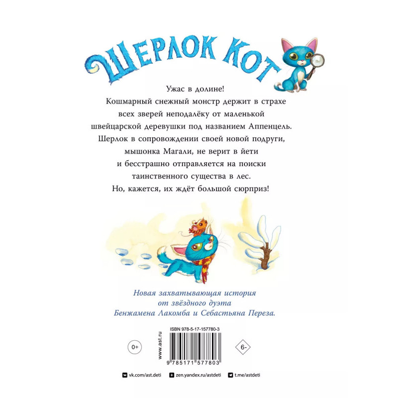 Шерлок Кот. КОТострофический снежный монстр. Ужас в долине! Кошмарный снежный монстр держит в страхе всех зверей неподалёку от маленькой швейцарской деревушки под названием Аппенцелль. Шерлок в сопровождении своей новой подруги, мышонка Магали, не верит в йети и бесстрашно отправляется на поиски таинственного существа в лес. Но, кажется, их ждёт большой сюрприз! Новая захватывающая история от звёздного дуэта Бенжамена Лакомба и Себастьяна Переза.