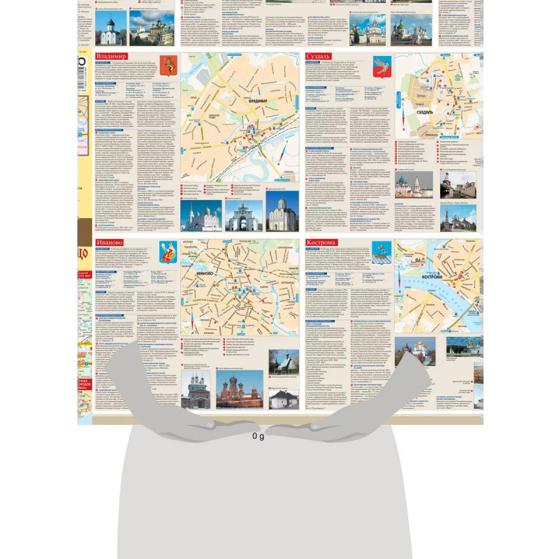 Складная туристическая карта "Золотое кольцо России" посвящена уникальному региону нашей страны, расположенному в междуречье Волги и Оки, где сосредоточены древние русские города, без которых немыслима история России. Масштаб карты 1:370 000 (в 1 см 3,7 км) и специально разработанная система условных обозначений позволили во всем многообразии представить имеющиеся в городах Золотого кольца исторические, архитектурные, религиозные и культурные памятники, многие из которых входят в список объектов Всемирного наследия ЮНЕСКО. На карте также подробно показана сеть автомобильных и железных дорог, обеспечивающих доступ к каждому из городов. Оборот карты представляет собой путеводитель по городам Золотого кольца, содержание которого составляют описания автомобильных маршрутов, исторические справки о каждом городе, адреса и месторасположение гостиниц, схемы городов Золотого кольца, их главные достопримечательности и музеи.