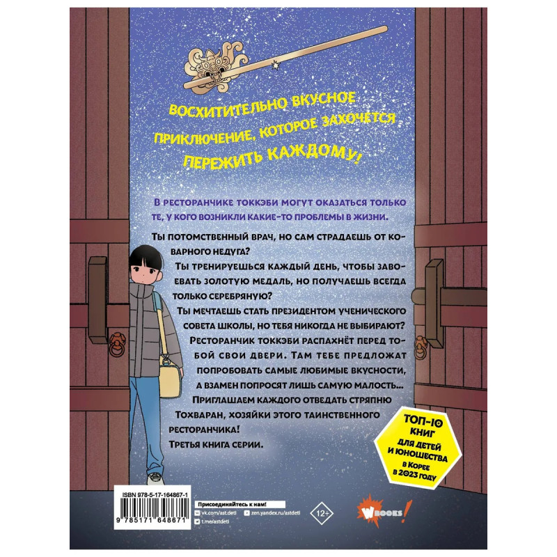 В ресторанчике токкэби могут оказаться только те, у кого возникли какие-то проблемы в жизни. Ты потомственный врач, но сам страдаешь от коварного недуга? Ты тренируешься каждый день, чтобы завоевать золотую медаль, но получаешь всегда только серебряную? Ты мечтаешь стать президентом ученического совета школы, но тебя никогда не выбирают? Ты хочешь дружить с девочкой, которая давно тебе нравится, но она не обращает на тебя внимания? Ресторанчик токкэби распахнёт перед тобой свои двери. Там тебе предложат попробовать самые любимые вкусности, а взамен попросят лишь самую малость Приглашаем каждого отведать стряпню Тохваран, хозяйки этого таинственного ресторанчика! Третья книга серии.