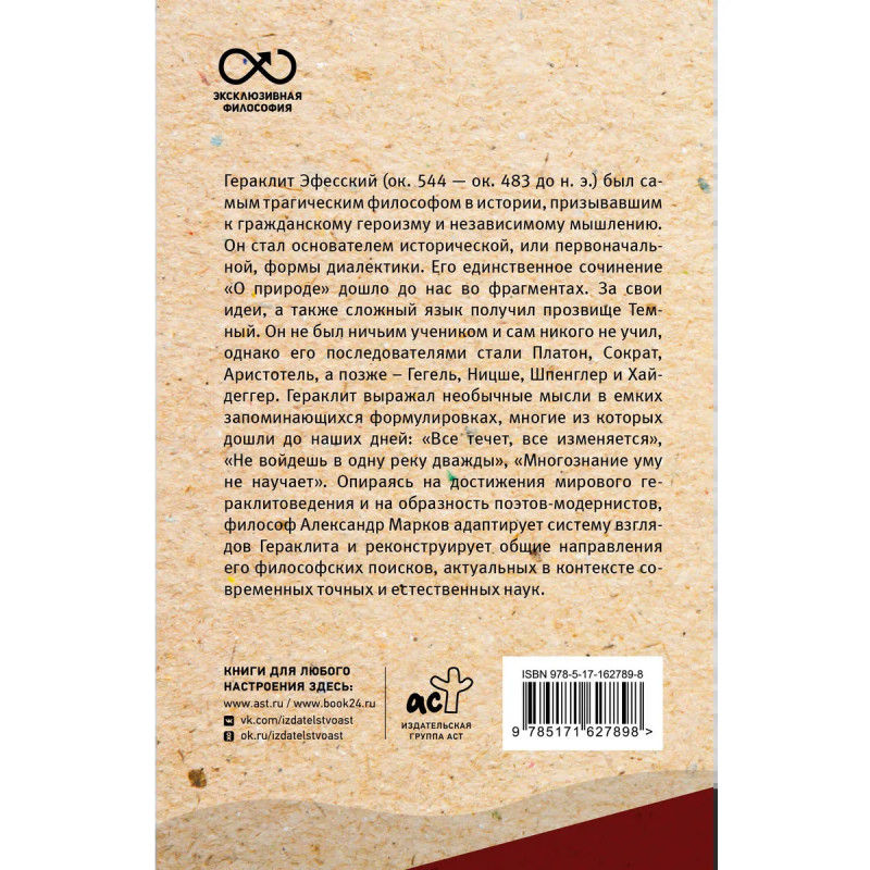 Гераклит Эфесский (ок. 544 ок. 483 до н. э.) был самым трагическим философом в истории, призывавшим к гражданскому героизму и независимому мышлению. Он стал основателем исторической, или первоначальной, формы диалектики. Его единственное сочинение "О природе" дошло до нас во фрагментах. За свои идеи, а также сложный язык получил прозвище Темный. Он не был ничьим учеником и сам никого не учил, однако его последователями стали Платон, Сократ, Аристотель, а позже Гегель, Ницше, Шпенглер и Хайдеггер. Гераклит выражал необычные мысли в емких запоминающихся формулировках, многие из которых дошли до наших дней: "Все течет, все изменяется", "Не войдешь в одну реку дважды", "Многознание уму не научает". Опираясь на достижения мирового гераклитоведения и на образность поэтов-модернистов, философ Александр Марков адаптирует систему взглядов Гераклита и реконструирует общие направления его философских поисков, актуальных в контексте современных точных и естественных наук.