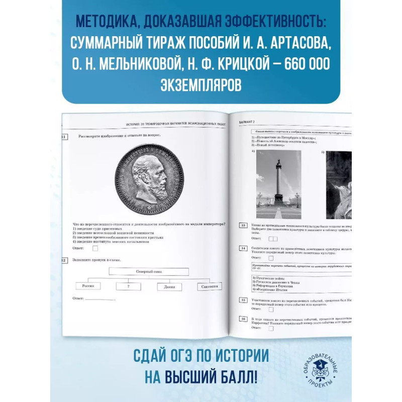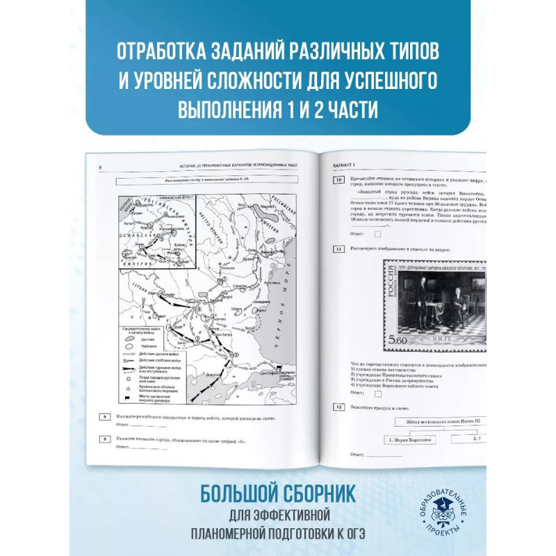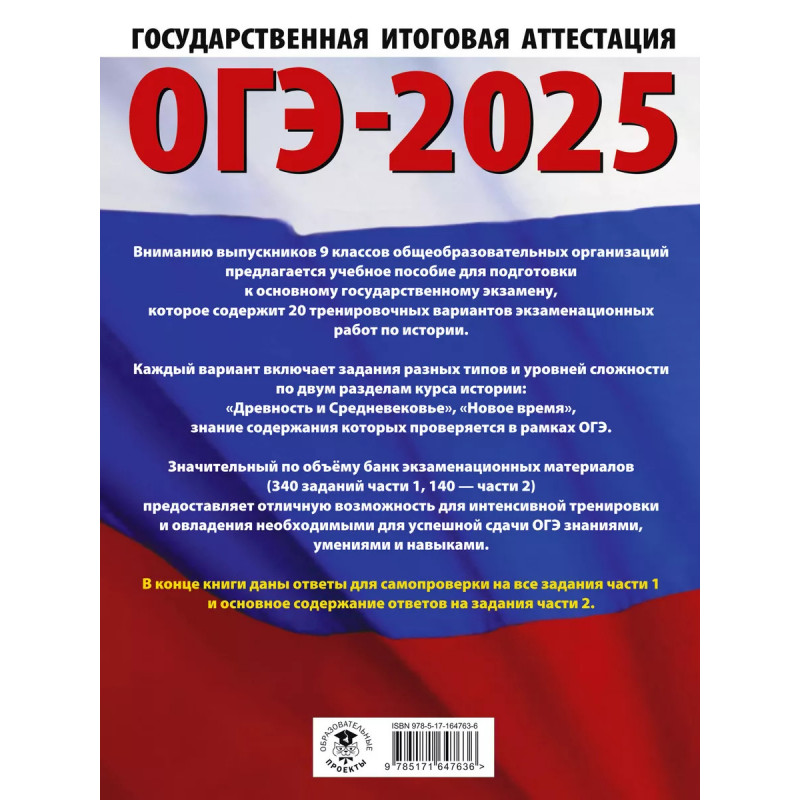 Вниманию выпускников 9 классов общеобразовательных организаций предлагается учебное пособие для подготовки к основному государственному экзамену (ОГЭ), которое содержит 20 тренировочных вариантов экзаменационных работ. Каждый вариант включает задания разных типов и уровня сложности по всем разделам курса истории России: "Древность и Средневековье", "Новое время", знание содержания которых проверяется в рамках ОГЭ. Значительный по объёму банк экзаменационных материалов (140 заданий части 1, 70 части 2) предоставляет отличную возможность для интенсивной тренировки и овладения необходимыми для успешной сдачи ОГЭ знаниями, умениями и навыками. В конце книги даны ответы для самопроверки на все задания части 1 и основное содержание ответов на задания части 2.