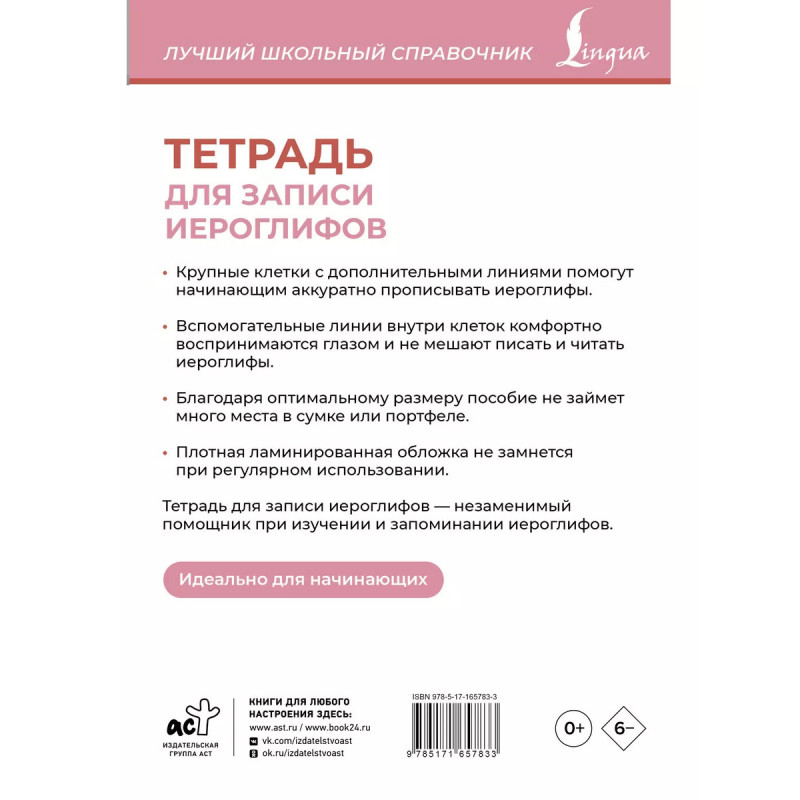 Характеристики Тетрадь для записи иероглифов (розовая).