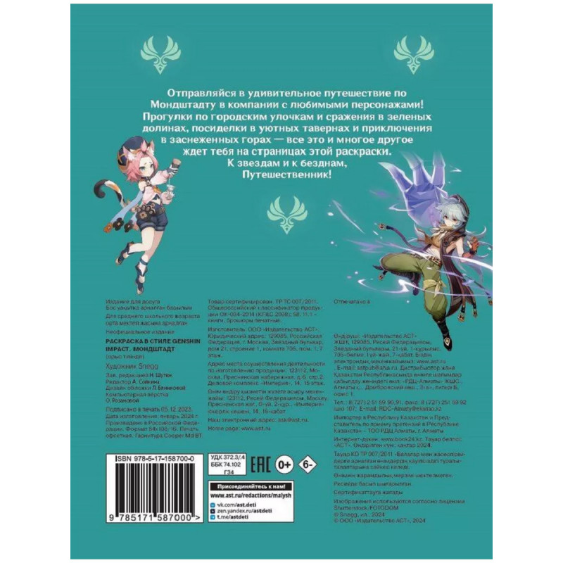 Раскраска в стиле Genshin Impact. Мондштадт. Отправляйся в удивительное путешествие по Мондштадту в компании с любимыми персонажами! Прогулки по городским улочкам и сражения в зеленых долинах, посиделки в уютных тавернах и приключения в заснеженных горах - все это и многое другое ждет тебя на страницах этой раскраски, нарисованной популярной художницей Snegg. К звездам и к безднам, Путешественник!