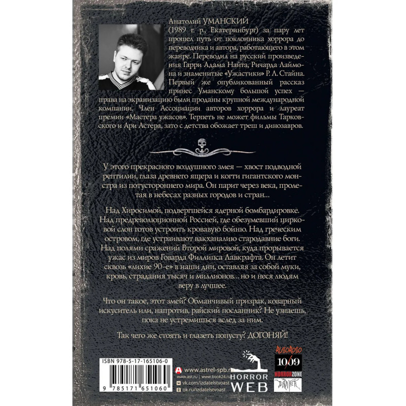 Новинка в серии Самая страшная книга. Для всех поклонников жанра хоррор. Для тех, кто уже прочитал Колумбарий и Из бездны. Анатолий Уманский известный автор, переводчик и поклонник жанра, член Ассоциации авторов хоррора, постоянный участник проекта Самая страшная книга и лауреат премии Мастера ужасов. Догоняй! первый авторский сборник Анатолия Уманского, в книгу вошли самые лучшие повести и рассказы, написанные за последние несколько лет. Из этих историй вы узнаете об обезумевшем слоне, готовом устроить бойню в царской России, о греческом острове, на котором устраивают вакханалию древние боги, и о полях сражений Второй Мировой, на которые прорываются ужасы из миров Говарда Филлипса Лавкрафта.