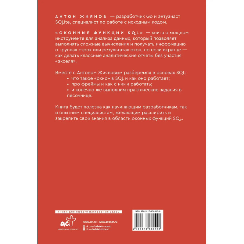 Антон Жиянов разработчик Go и энтузиаст SQLite, специалист по работе с исходным кодом. "Оконные функции SQL" книга о мощном инструменте для анализа данных, который позволяет выполнять сложные вычисления и получать информацию о группах строк или результатах окон, но если вкратце как делать классные аналитические отчеты без участия "экселя". Вместе с Антоном Жияновым разберемся в основах SQL: что такое "окно" в SQL и как оно работает; про фреймы и как с ними работать; и конечно же выполним практические задания в песочнице. Книга будет полезна как начинающим разработчикам, так и опытным специалистам, желающим расширить и закрепить свои знания в области оконных функций SQL.