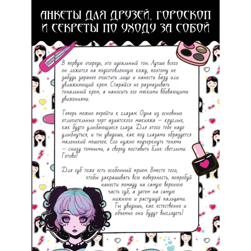 Этот милый дневничок станет прекрасным подарком для любой девочки, которая хочет познакомиться с азиатской культурой и любит аниме и готику. В нем можно украсить страницы, познакомиться с японскими гаданиями и секретами ухода за кожей, узнать о себе что-то новое благодаря волшебному тесту и загадочным гороскопам! Для младшего школьного возраста
