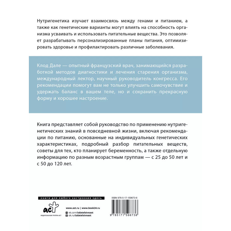Нутригенетика изучает взаимосвязь между генами и питанием, а также как генетические варианты могут влиять на способность организма усваивать и использовать питательные вещества. Это позволяет разрабатывать персонализированные планы питания, оптимизировать здоровье и профилактировать различные заболевания. Книга представляет собой руководство по применению нутригенетических знаний в повседневной жизни. Она содержит рекомендации по питанию, основанные на индивидуальных генетических характеристиках, подробный разбор питательных веществ, советы для тех, кто планирует беременность, а также отдельную информацию по разным возрастным группам с 25 до 50 лет и с 50 до 120 лет.