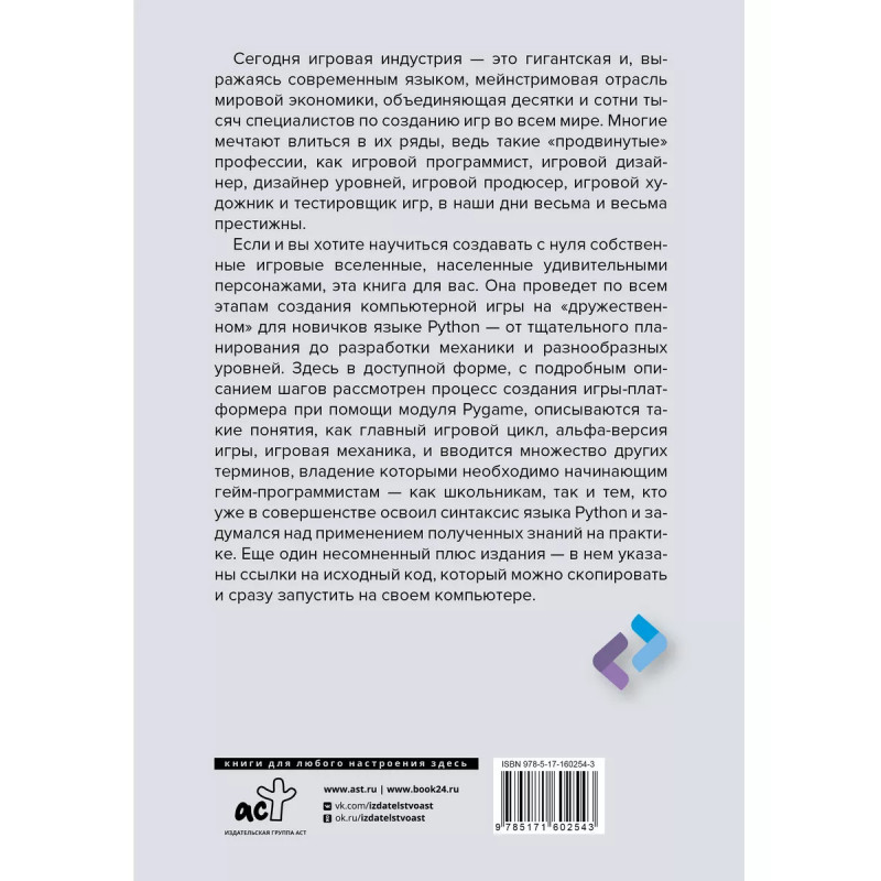 Эта книга - практическое пособие для начинающих программистов, желающих научиться создавать с нуля компьютерные игры на "дружественном" для новичков языке Python. Каждый ее раздел представляет собой проектирование очередного этапа игры, включая придумывание и "оживление" игрового персонажа, его противников, разработку дополнительных игровых элементов и налаживание их взаимодействия между собой. Кроме того, в ней рассмотрены тонкие моменты, связанные с подготовкой графических изображений и звуковых файлов с целью создания визуальных и звуковых эффектов. Все разделы содержат примеры исходного кода с подробным описанием работы каждого его фрагмента. Авторы доступным языком описывают, как использовать библиотеку Pygame для выстраивания графики, обработки пользовательского ввода и управления игровым процессом, что делает материал понятным для новичков, и дают ссылки на исходный код, который можно скопировать и сразу запустить на своем компьютере. Данное издание поможет овладеть основами разработки игр на Python и,