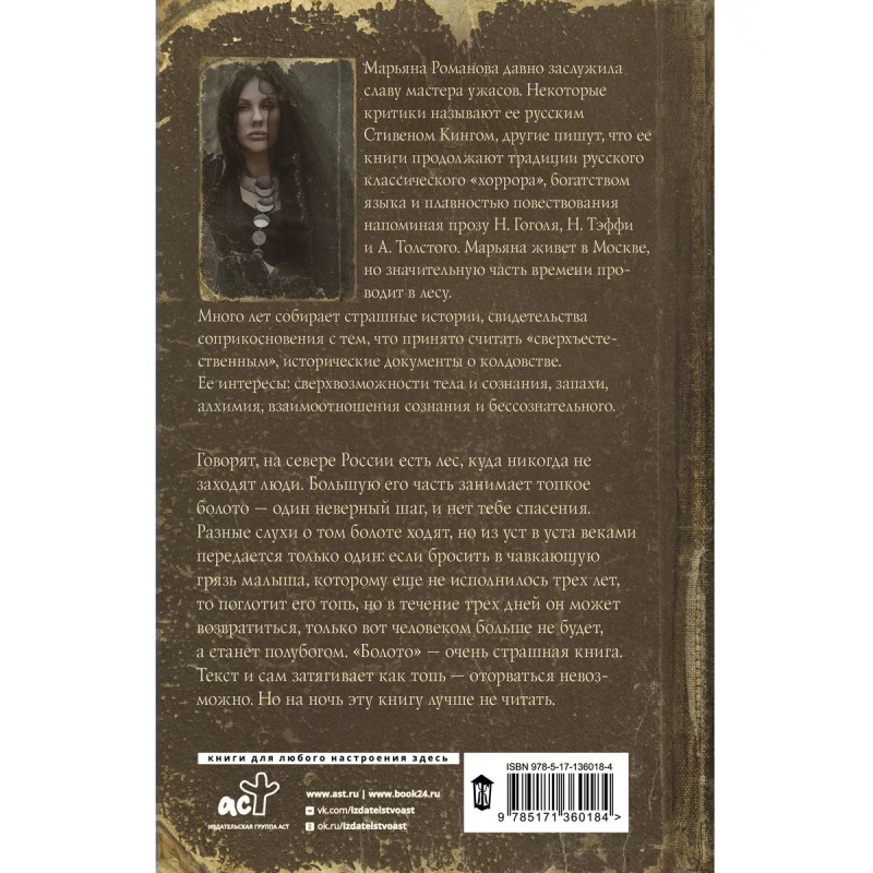 Говорят, на севере России есть лес, куда никогда не заходят люди. Большую его часть занимает топкое болото - один неверный шаг, и нет тебе спасения. Разные слухи о том болоте ходят, но из уст в уста веками передается только один: если бросить в чавкающую грязь малыша, которому еще не исполнилось трех лет, то поглотит его топь, но в течение трех дней он может возвратиться, только вот человеком больше не будет, а станет полубогом. "Болото" - очень страшная книга. Текст и сам затягивает как топь - оторваться невозможно. Но на ночь эту книгу лучше не читать.