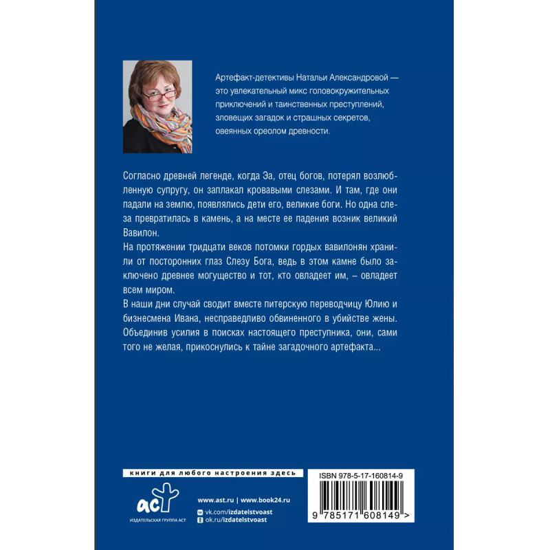 - Детективный роман в удобном карманном формате. - Наталья Александрова - автор более 60 остросюжетных историй. - Артефакт-детективы Натальи Александровой - это увлекательный микс запутанных преступлений, мистических загадок и секретов, овеянных ореолом древности. - Легкий и приятный авторский стиль и глубоко прописанные исторические детали. В центре сюжета - легенда древних вавилонян об отце всех богов Эа, который потерял свою возлюбленную и заплакал кровавыми слезами. По легенде, слезы его горя превратились в богов, а одна слеза обратилась в камень, из которого и был воздвигнут город Вавилон. Могущественный артефакт "Слеза Бога" тысячелетиями хранился потомками жрецов Вавилона вдали от обычных людей. Однако несчастный случай позволил Юлии и Ивану соприкоснуться с древней тайной.