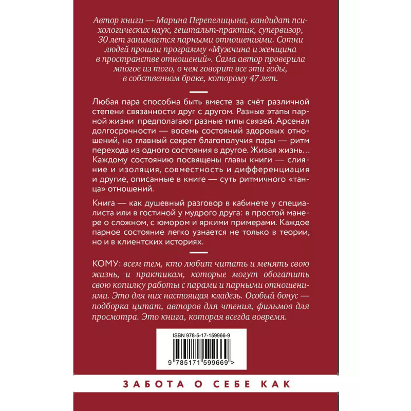 Любая пара может быть вместе за счет различной степени связанности друг с другом. Разные этапы парной жизни предполагают разные типы связей. Арсенал долгосрочности восемь состояний здоровых отношений, но главный секрет благополучия пары ритм перехода из одного состояния в другое. Живая жизнь Каждому состоянию посвящены главы книги слияние и изоляция, совместность и дифференциация и другие, описанные в книге суть ритмичного "танца" отношений.
