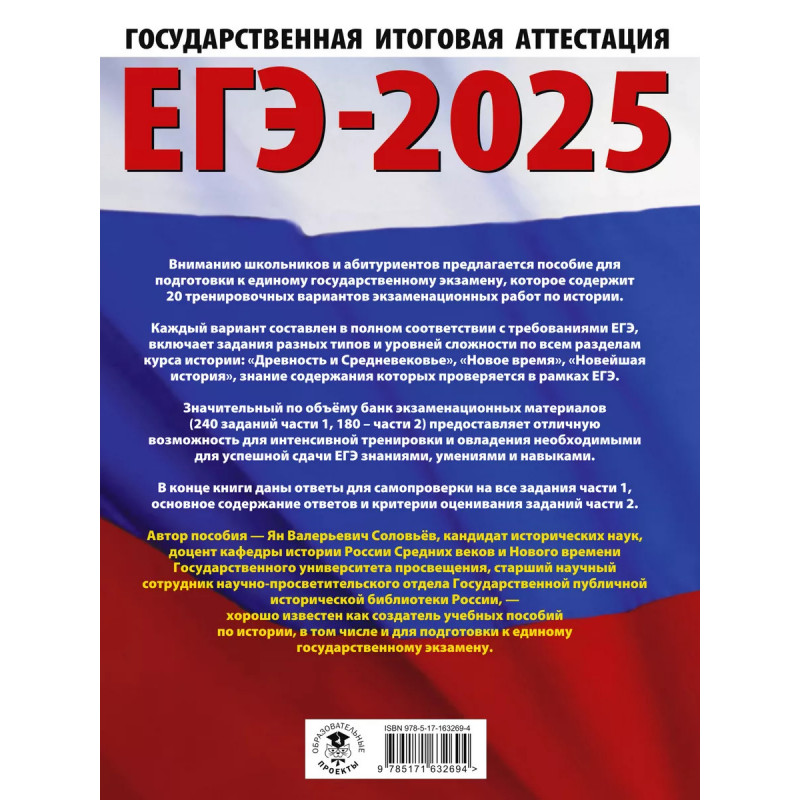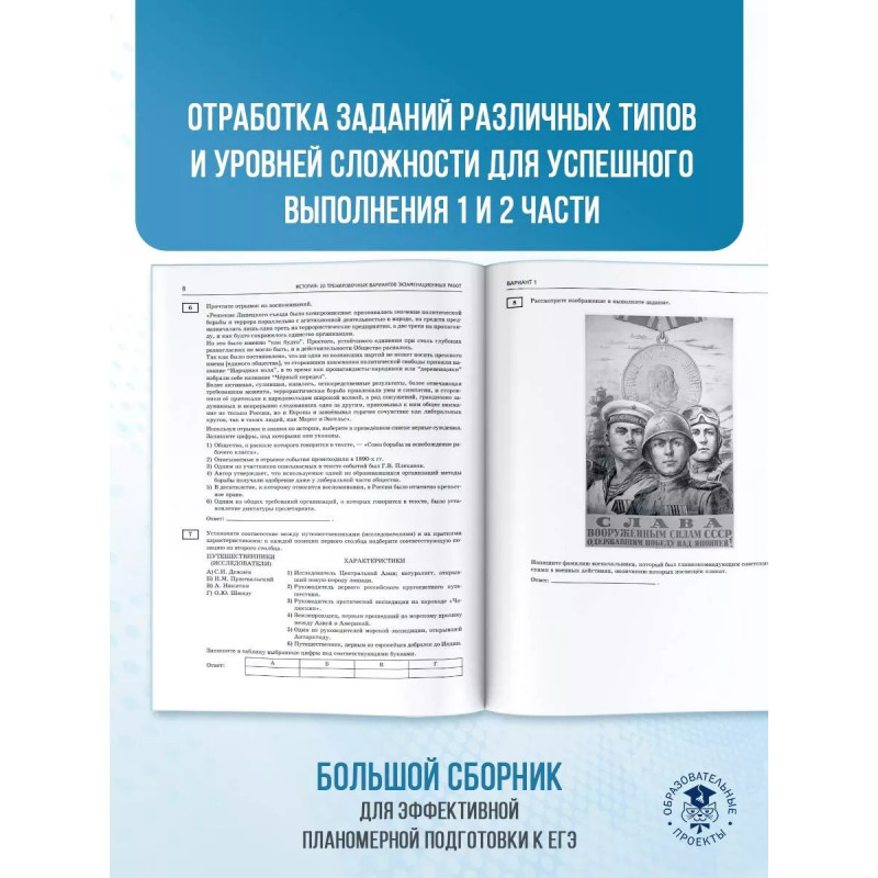 Вниманию школьников и абитуриентов предлагается пособие для подготовки к единому государственному экзамену, которое содержит 20 тренировочных вариантов экзаменационных работ по истории. Каждый вариант составлен в соответствии с требованиями ЕГЭ, включает задания разных типов и уровней сложности по всем разделам курса истории: "Древность и Средневековье", "Новое время", "Новейшая история", знание содержания которых проверяется в рамках ЕГЭ. Значительный по объёму банк экзаменационных материалов (220 заданий части 1, 160 части 2) предоставляет отличную возможность для интенсивной тренировки и овладения необходимыми для успешной сдачи ЕГЭ знаниями, умениями и навыками. В конце книги даны ответы для самопроверки на все задания части 1, основное содержание ответов и критерии оценивания заданий части 2.