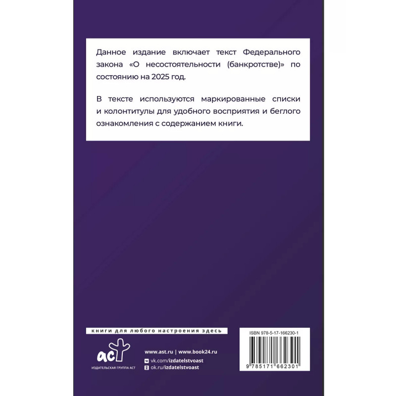 Данное издание включает текст Федерального закона "О несостоятельности (банкротстве)" на 2025 год. В тексте используются маркированные списки и колонтитулы для удобного восприятия и беглого ознакомления с содержанием книги. Издание учитывает все изменения, опубликованные в официальных источниках на момент подписания издания в печать.