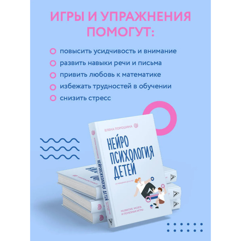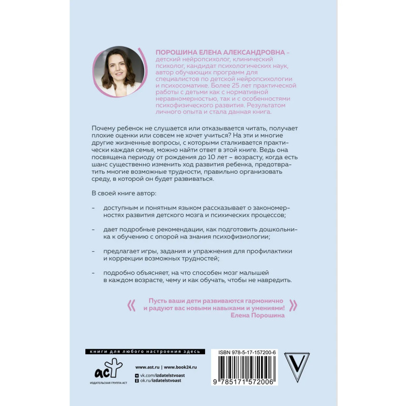 Порошина Елена Александровна - детский нейропсихолог, клинический психолог, кандидат психологических наук, автор обучающих программ для специалистов по детской нейропсихологии и психосоматике. Более 25 лет практической работы с детьми как с нормативной неравномерностью, так и с особенностями психофизического развития. Результатом личного опыта и стала данная книга. Почему ребенок не слушается или отказывается читать, получает плохие оценки или совсем не хочет учиться? На эти и многие другие жизненные вопросы, с которыми сталкивается практически каждая семья, можно найти ответ в этой книге. Ведь она посвящена периоду от рождения до 10 лет возрасту, когда есть шанс существенно изменить ход развития ребенка, предотвратить многие возможные трудности, правильно организовать среду, в которой он будет развиваться.
