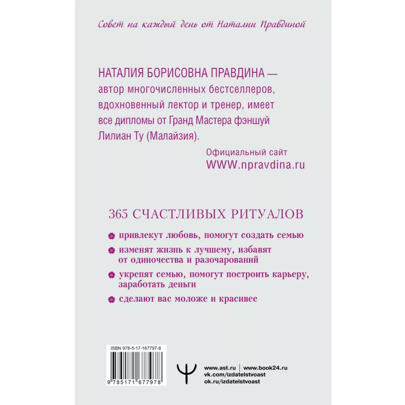 Согласно Ведам, древнеиндийским текстам, Луна усиливает внутреннюю "тонкую" энергию женщины. Женщина, живущая по лунному календарю, всегда прекрасна! Луна это сила, тайна и мудрость. Согласуя свою жизнь с лунным календарем, вы раскрываете в себе Женщину-Богиню! В "Календаре для женщин на 2025 год. 365 практик от Мастера. Лунный календарь" Наталии Правдиной вы найдете подробные рекомендации на каждый день предстоящего года. Они помогут вам привлечь любовь, создать семью, изменить жизнь к лучшему, избавиться от одиночества, построить карьеру, заработать деньги, стать красивее и чувствовать себя моложе.